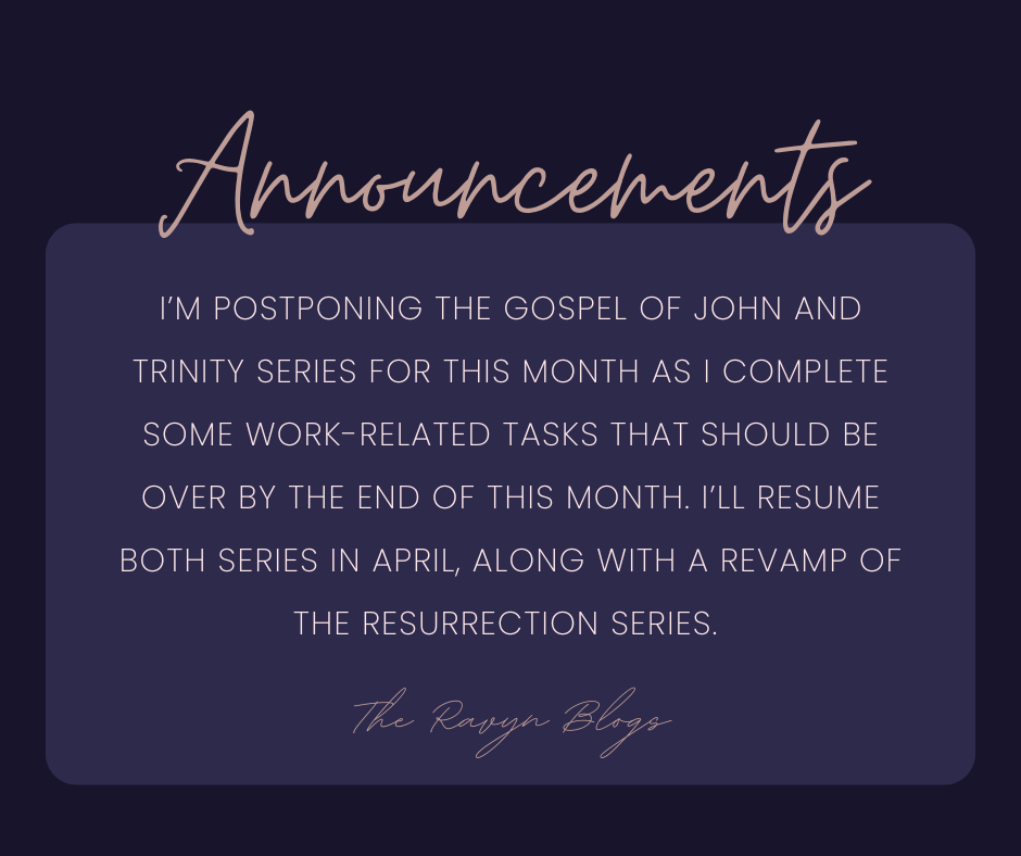 I’m postponing the Gospel of John and the Trinity Series for this month as I complete some work-related tasks that should be over by the end of this month.